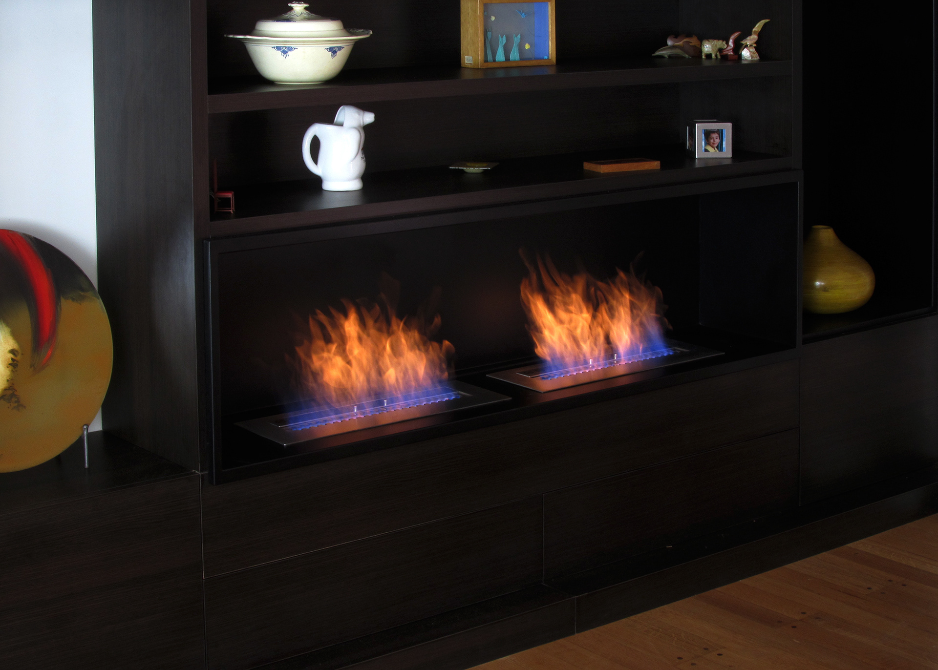 Shelving with built-in fireplace and alcoves: